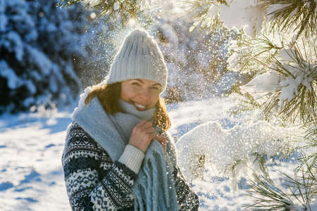 Portrait of a lovely young woman dressed in a knitted hat, scarf and sweater in the winter forest. Backlight, Snow is falling from the pine branches. The girl is smiling looking straight into the camera.