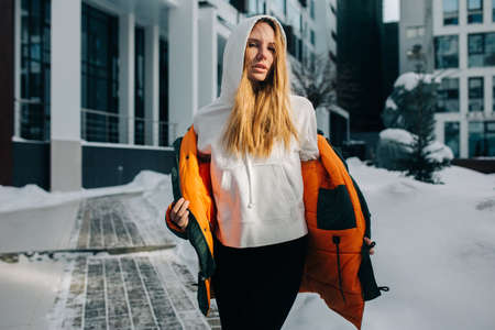 Photo of blonde girl in hood and in jacket against winter day