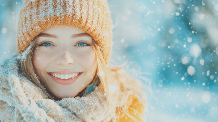Caucasian young adult woman smiling in winter snow wearing warm hat cozy joyful portrait.