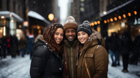 Fashionable friends embrace the holiday spirit, showcasing winter outfits while surrounded by twinkling lights, decorations, and a gentle snowfall during Christmas.