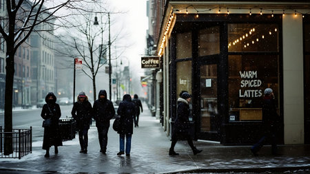 People walking on a snowy street, some using smartphones, coffee shop in view, winter scene