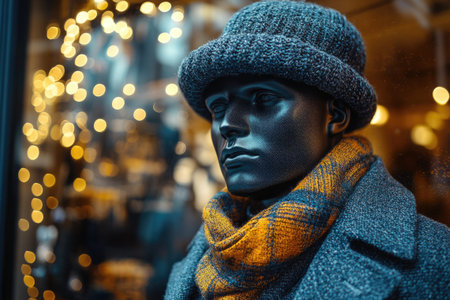 Black mannequin wearing a warm winter outfit, composed of a hat and a scarf, posing in front of a shop window with blurred lights in the background