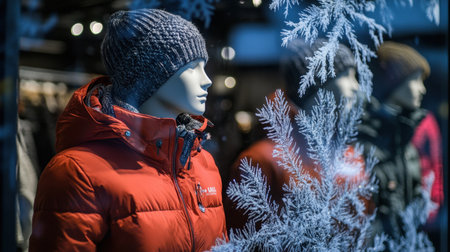 A warm puffer jacket displayed on a mannequin, ideal for showcasing winter fashion in a retail setting