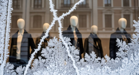 Frost patterns on a shop window with blurred mannequins inside. Winter retail display during a cold season and Frozen City concept.