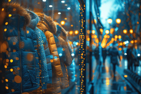 Christmas decoration in shop window. Mannequins in winter clothes.