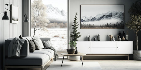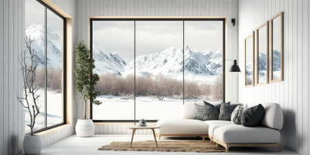 Interior of modern living room with wooden furniture, carpet, pillows, books, coffee table and window with winter landscape