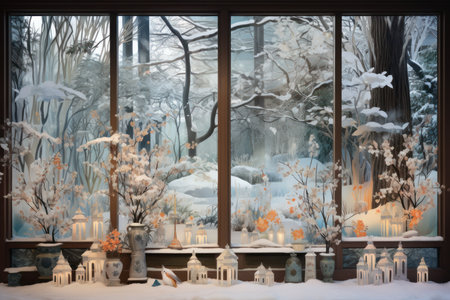 An interior shot reveals a train window framing a wintery forest. Inside, a seat with cushions and a blanket sits near the window, decorated with soft glowing lights. The scene suggests travel during a winter day. Suitable for illustrations related to travel, leisure, or design projects.