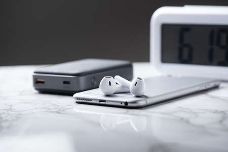 Modern power bank, smartwatch, earphones and mobile phone on gray background
