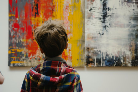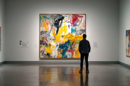 A young man observes colorful abstract artwork in a modern gallery, representing culture, appreciation, and creativity.
