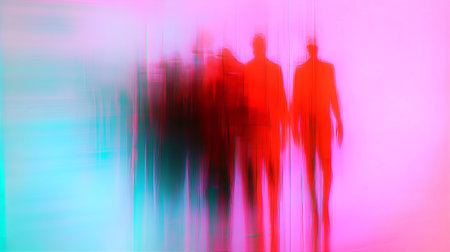 Abstract silhouettes against colorful geometric background create dynamic visual contrast