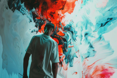 Individual stands in a bright, minimalist gallery observing a vibrant abstract art piece. The atmosphere is calm and reflective, showing creativity and expression.