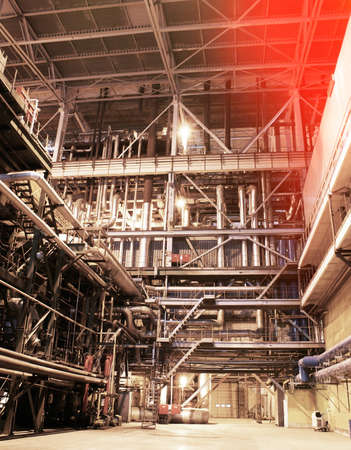 Coal power plant interior with pipes. Heat exchanger and energy equipments
