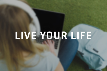 high angle view of young woman sitting on grass with headphones on head and working with laptop, live your life inscription