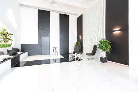 Luxurious futuristic trendy modern interior in contrasting black and white colors with interesting fashionable black furniture and decorated wall