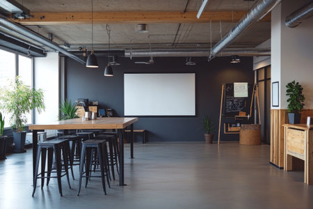 Design of a bar with a high table and black stools, a whiteboard on the wall in the back, a concrete floor, an industrial-style interior design, a warm lighting atmosphere, a symmetrical composition, wooden furniture, high-resolution photography, a wide-angle lens, natural light, a symphonic feel, a professional photographer's work, and depth of field. --ar 3:2 --v 6.1 Job ID: 7d6dbe5e-2402-4603-bd63-1a5b8ce6c29b