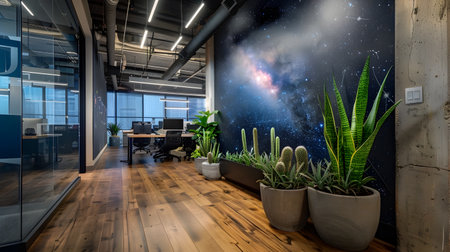 Interior light glowing office, modern natural material and creative design working space working room in modern office interior design AI generated