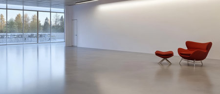 A minimalist lounge area is displayed with sleek red chairs positioned elegantly. Large windows let in natural light showcasing an outdoor view of greenery and a balcony.
