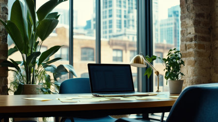 Contemporary digital rendering that conveys a productive and inviting mood through precise composition and subtle warm illumination. Suited for interior design showcases, coworking space promotions, professional lifestyle visuals, and branding for remote teams or creative firms. Its clean lines and harmonious elements offer flexibility for web banners, social media g... AI-generated illustration.