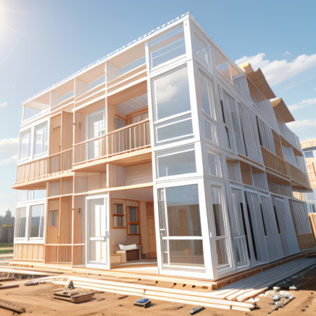 Builders working together to assemble prefabricated modules for a project, demonstrating the effectiveness and sustainability of modern,
