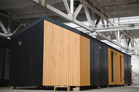 Modern modular home displayed in production facility. concept of innovative architecture, prefabrication, sustainable building, contemporary design.