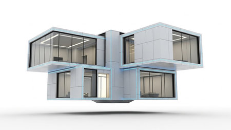 A futuristic, multi-level house appears to float, featuring geometric shapes, extensive glass walls, and illuminated by subtle blue lighting, set against a white background.