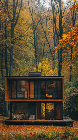 Tranquil modern house nestled in a forest, featuring large windows and warm wood decor, inviting outdoor space perfect for relaxation in a serene natural environment.