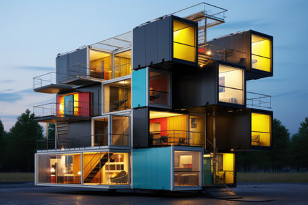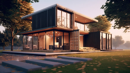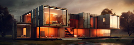 Shipping container house with illuminated interior and colorful accents reflecting on wet pavement at sunset. Ai generated image