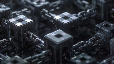 An abstract representation of microchips and electronic components arranged in an intricate pattern. This high-resolution image highlights various shapes and textures that emphasize innovation and technology. Perfect for tech-related themes.
