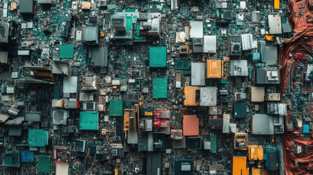 A detailed overhead view of a complex arrangement of electronic components and circuit boards featuring vibrant colors and intricate textures.