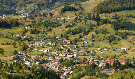 Autumn background in the mountains. Hills covered with yellow trees and houses