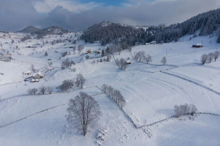 Winter frosty landscape of the beautiful Transylvanian village, Bran, with fresh snow, at the foot of the Carpathian Mountains