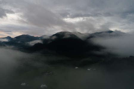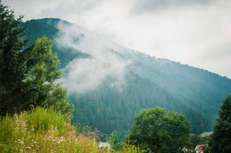 Fog and rain in the Carpathian mountains. Mountain village Dzembronya in the Carpathian mountains, Ukraine. Panoramic photo of mystical mountain landscape.