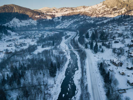 Calm and cosy fairy-tale village Kryvorivnia covered with snow in the Carpathians mountains, aerial view. Typical landscape in Hutsulshchyna National Park in Ukraine. Vacation and winter sports.