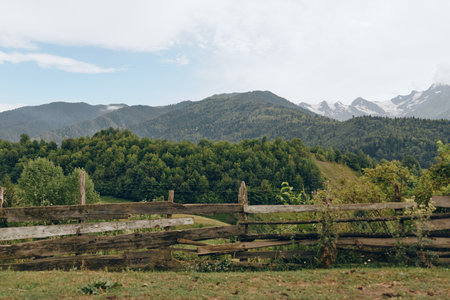 Landscape mountains fence meadow trees rural countryside wooden pastoral scene with rolling green hills, sunlit grass and rustic fence