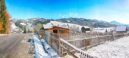 Fantastic winter landscape with wooden houses in snowy mountains. First snow in mountains. Location: Carpathian Mountains, Ukraine, Europe