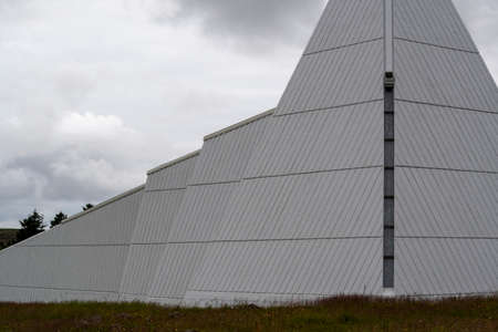Glass and steel pyramidal complex on lawn in Reykjavik at sunset