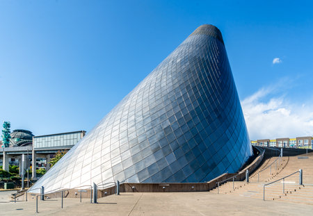 SAPPORO, JAPAN - 05 MAY 2024 : The symbol of Moerenuma park, the glass pyramid Hidamari, on February 5 in Sapporo. The glass pyramid is multi-purpose space, such as cultural activities and museum