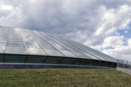 Contemporary architecture with transparent panels and steel. Glass roof of modern building with triangular structure. Real photo