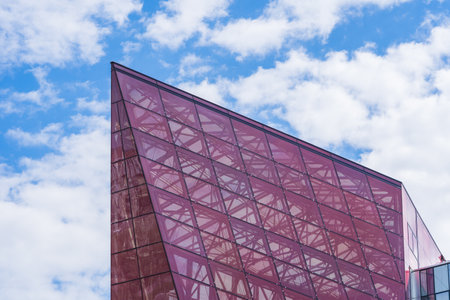 The glass panels of a building with reflection of clouds. Latvia, Riga