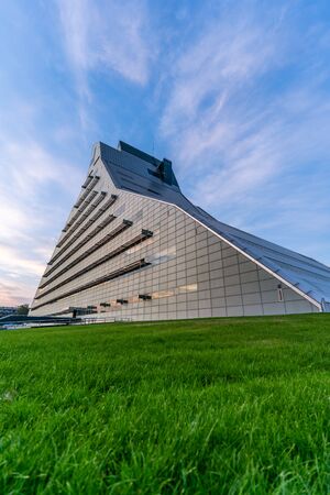 Riga / Latvia - September 10th, 2018: Modern Library Building Gaismas Pils with Sunset Color and Dramatic Sky - Concept of Futuristic Modern Day Buildings in Correlation with Nature, Place for Text