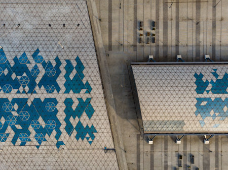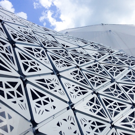 Geometric metal structure with glass, ceiling in a shopping center against the sky