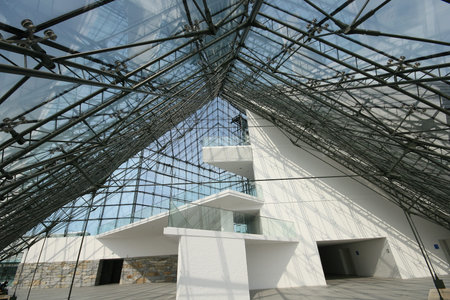 SAPPORO, JAPAN - FEBRUARY 2015: The symbol of Moerenuma park, the glass pyramid Hidamari, on February 5 in Sapporo. The glass pyramid is multi-purpose space, serves as cultural activities, museum and shop.