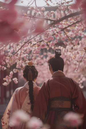Japanese couple in traditional clothes in a Japanese garden with cherry blossoms in springtime.