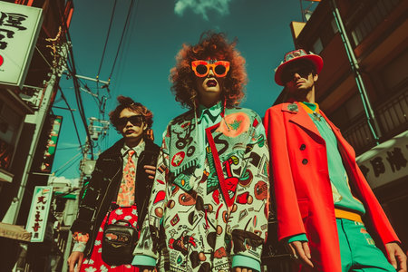 Vibrant and trendy group of young adults showcasing bold and eclectic street style in an urban setting