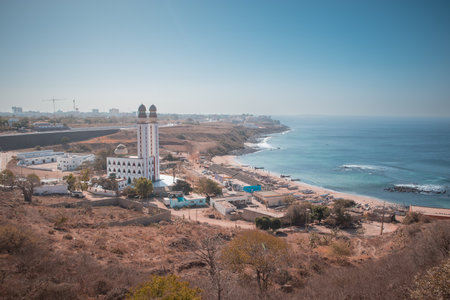 Panorama of mosque de divinite or divinity, viewed from high above. Dakar city seen in the background, warm sunny feeling, some haze