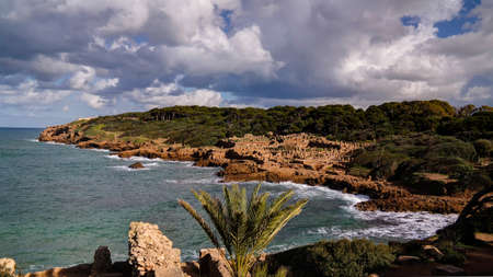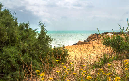 Mediterranean landscape. Coastal stones, cloudy sky, sea view. Plant and flowers are in the foreground. Spain, Alicante, Costa Blanca
