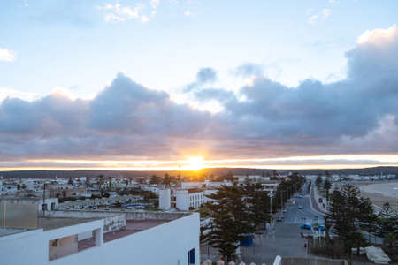 Moroccan fort city in Essaouira. Essaouira ancient building walls and fortress in Medina at sunset time