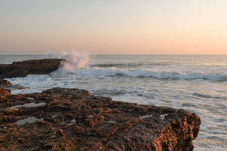 Waves breaking on the rock in the Atlantic ocean in Portugal in a beautiful sunset on a sunny day