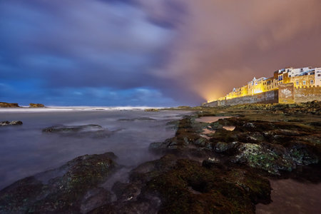Dramatic View of Essaouira old city and ocean at night time, Morocco.