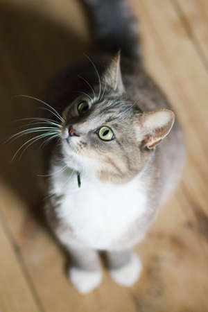 Beautiful cat sitting on the wooden floor and looking at the camera